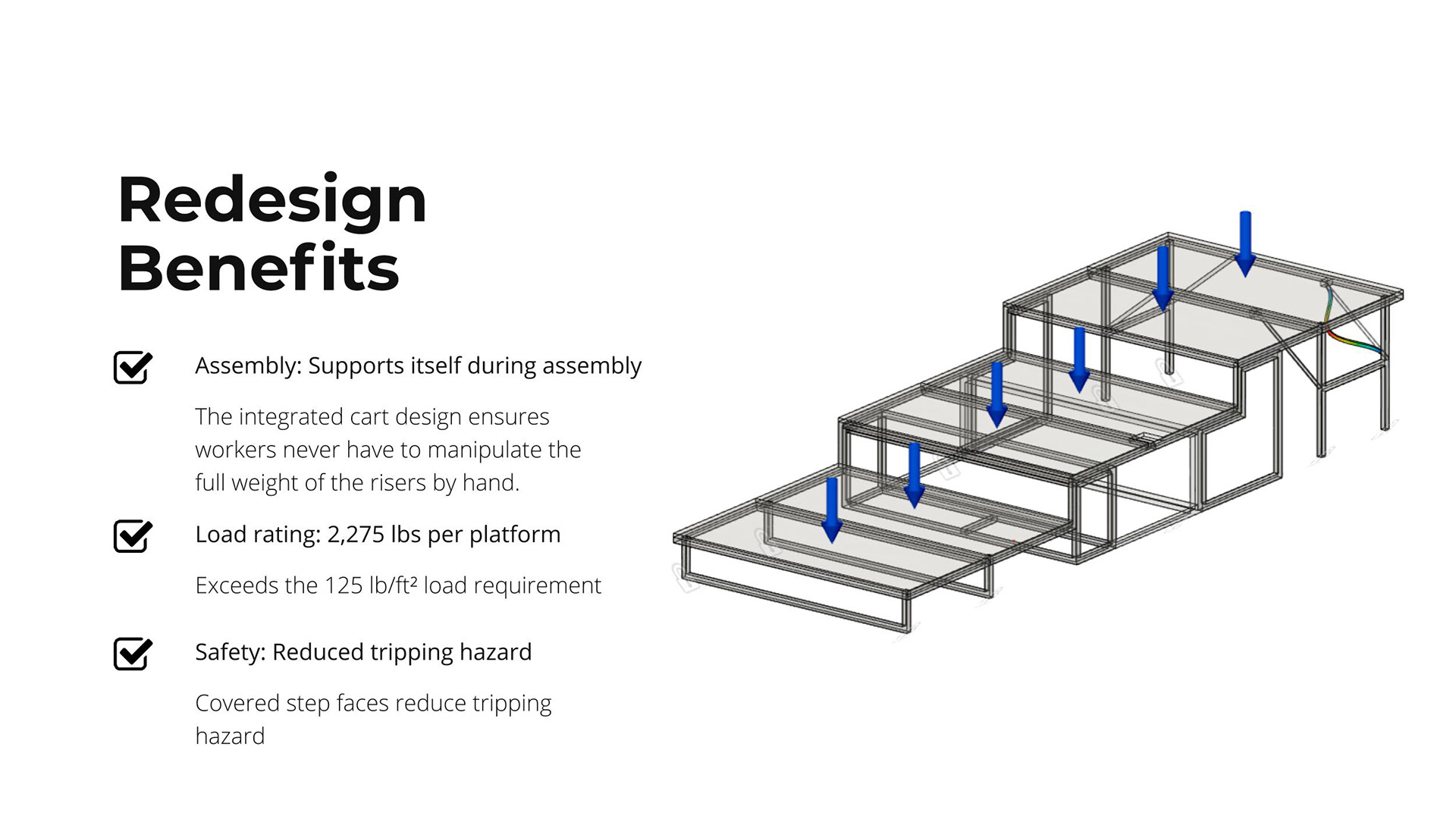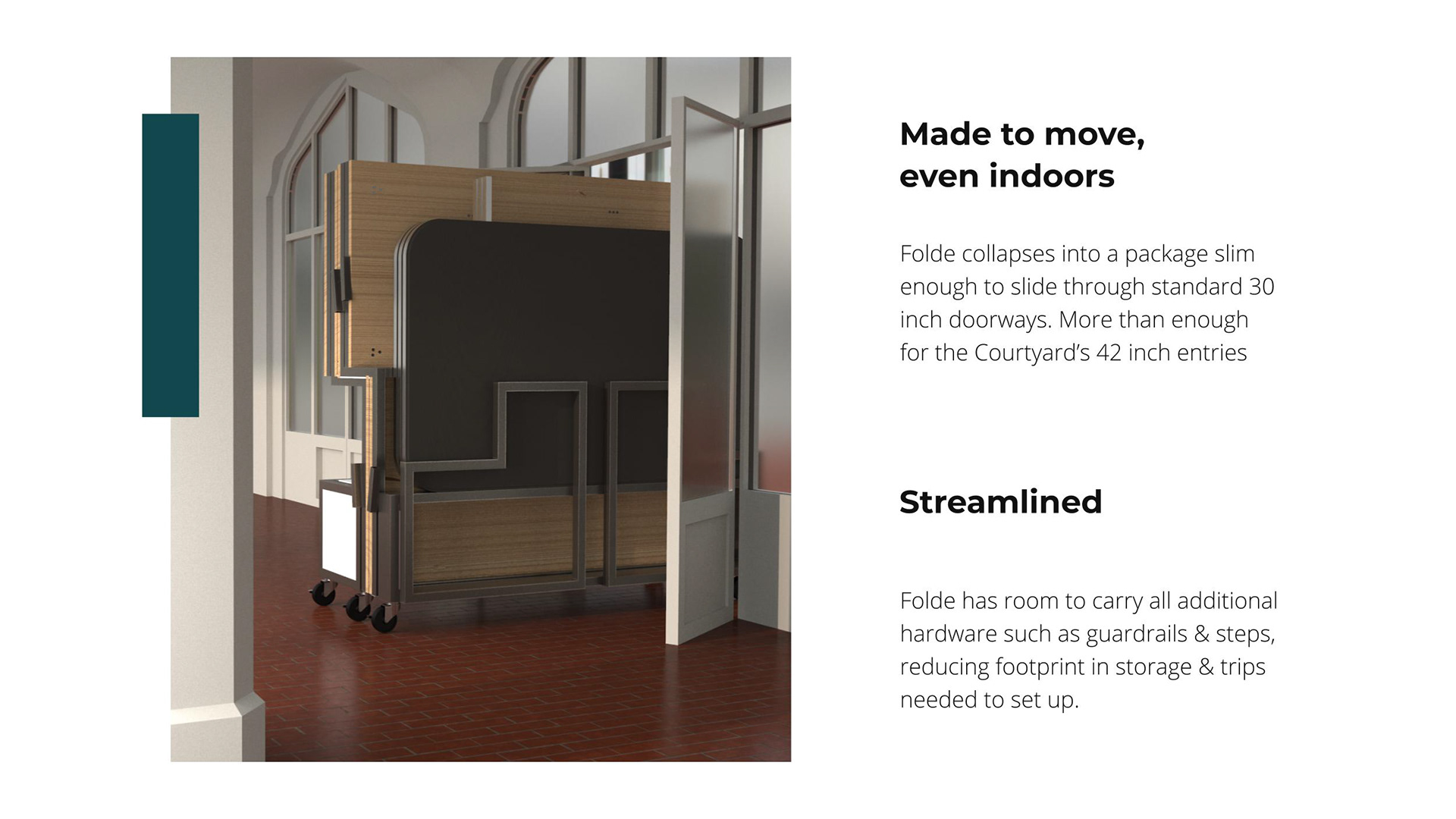 Folde works off the principle of integrating the cart and riser into one object, so that the weight of the platforms is supported at all times, and workers never have manipulate the full weight of the system
