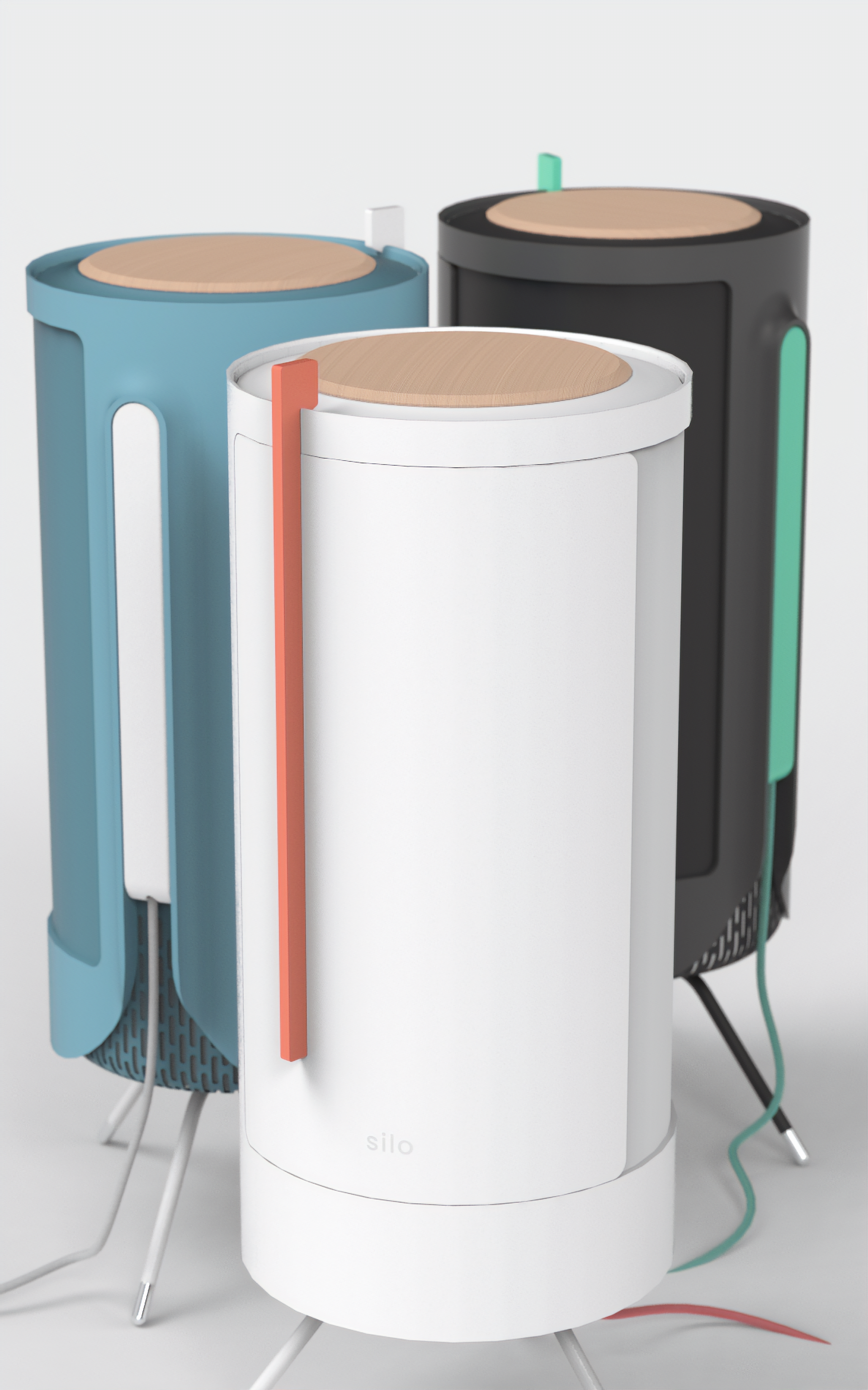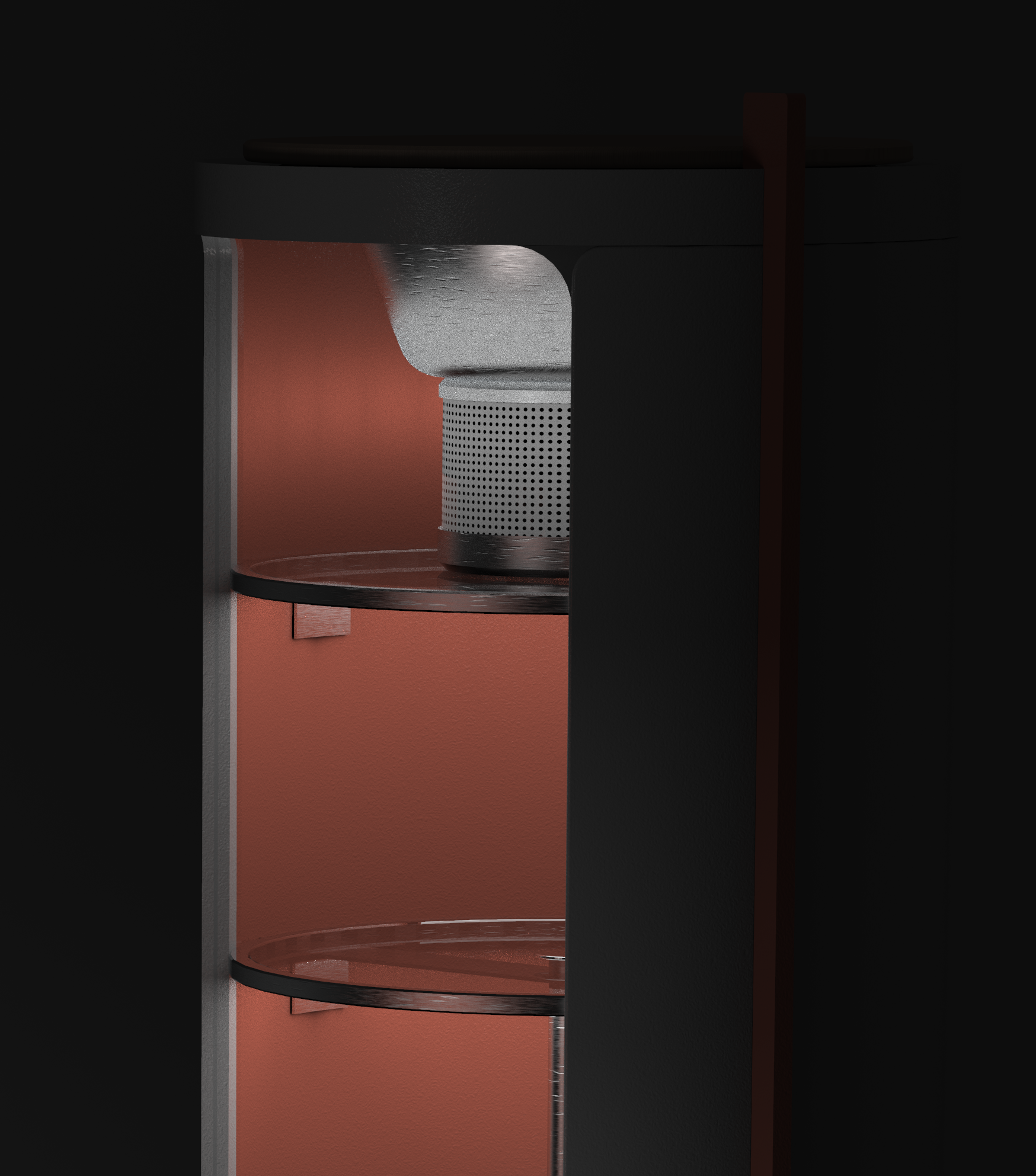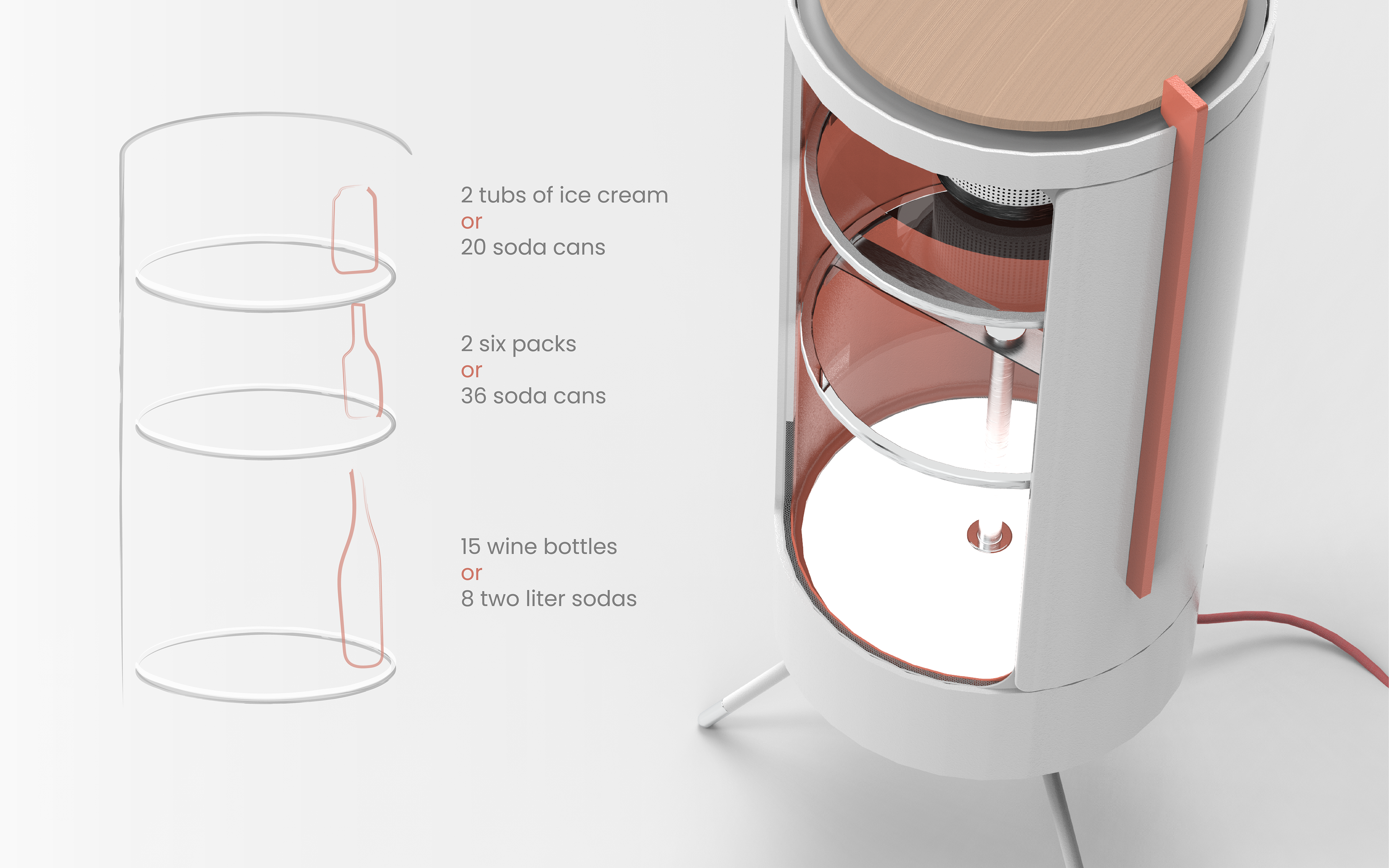 Silo has three Lazy Susan shelves making all items easy to reach. This design not only makes the most use of silo's cylindrical shape, it creates a joyful and memorable interaction. Top and bottom diffuse lights softly and luxuriously light the interior.